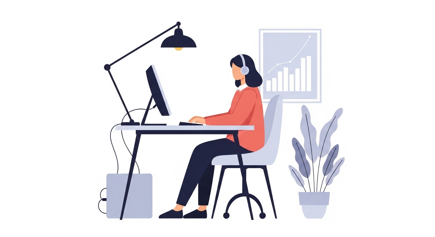 「パソコンを操作している女性、明るい部屋、イラスト風、ミニマルデザイン、白背景」